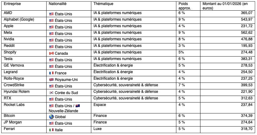 Au total, le portefeuille 2026 couvre, selon mon propre dĂ©coupage, les 6 grandes thĂ©matiques suivantes : IA & plateformes numĂ©riques đ, Ă©lectrification & Ă©nergie, cybersĂ©curitĂ©, souverainetĂ© & dĂ©fense đĄïž, lâespace, la finance et le luxe.