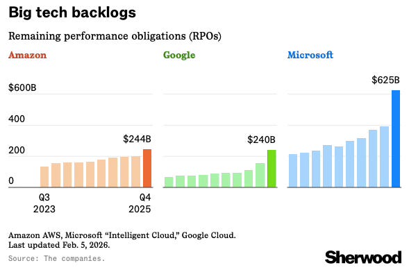 Selon le mĂ©dia Sherwood, le chiffre dâaffaires non encore rĂ©alisĂ© pour Amazon, Google et Microsoft atteindrait environ 1 100 milliards de dollars cumulĂ©s, soit prĂšs de deux fois les CAPEX prĂ©vus pour 2026 (Meta inclus) !