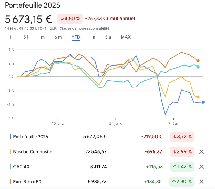 Depuis le 1er janvier, le portefeuille affiche un recul dâenviron 3,7 %. Une performance comparable Ă celle du Nasdaq Composite, qui sert ici dâindice de rĂ©fĂ©rence.