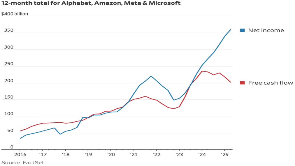 Avec l’essor de l’intelligence artificielle ces deux dernières années, les géants de la Big Tech deviennent beaucoup plus “asset-heavy”. Leur free cash-flow, ou la capacité à générer du cash supplémentaire, se réduit ⬇️.