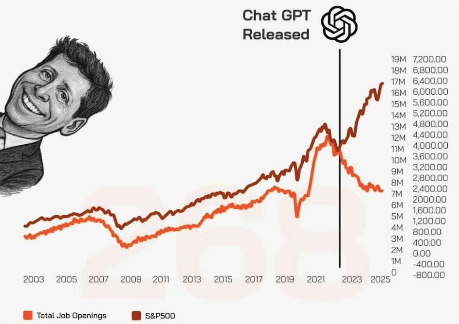 Depuis le lancement de ChatGPT, la corrélation ne s’observe plus : le S&P 500 poursuit sa hausse vertigineuse, tandis que les créations d’emplois ne cessent de baisser.