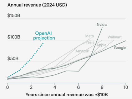 Quoi qu’il en soit, les revenus d’OpenAI dépasseront 10 milliards de dollars en 2025, quatre fois plus que l’an dernier. À l’avenir, cette croissance pourrait même s’accélérer. Comme le montre le graphique ci-après, seules sept entreprises américaines (et pas des moindres) ont atteint 100 milliards de revenus en moins d’une décennie.