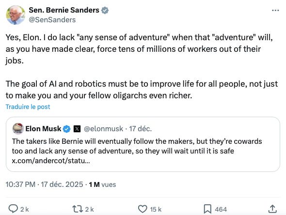 Il y a une semaine, la joute entre Bernie Sanders et Elon Musk au sujet de l’arrêt de la construction des centres de données pour l’IA montre que le débat s’amplifie aux États-Unis.