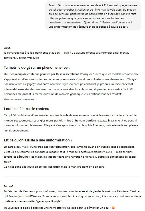 Il y a quelques jours, je me suis amusĂ© Ă interroger ChatGPT sur ce quâil pensait des newsletters gĂ©nĂ©rĂ©es par IA. Sa rĂ©ponse se trouve juste aprĂšs. Avec une touche dâhumour Ă la fin. Un humain nâaurait pas mieux rĂ©pondu.