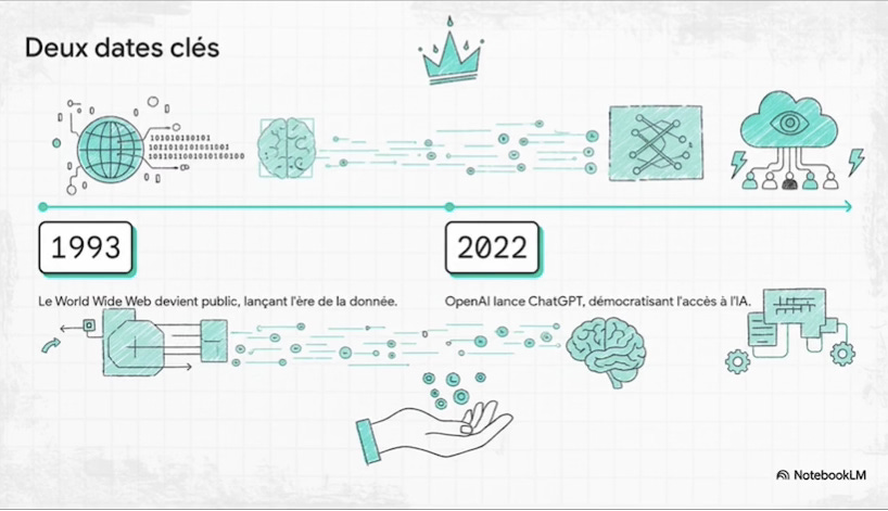 De plus, dans la vidĂ©o, des slides illustrent le propos de maniĂšre convaincante. Par exemple, NotebookLM a repris deux dates essentielles de mon livre pour en faire une diapositive đïž Ă©purĂ©e, simple mais efficace :